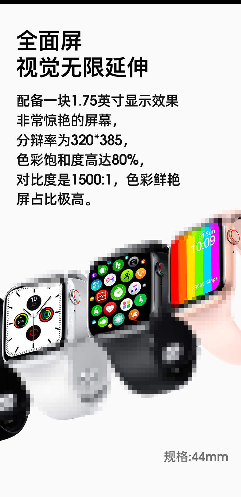 the main selling points of the product support Bluetooth calling, body temperature, heart rate, ECG, blood pressure, step counting, fruit 5 generation size, 44mm specification strap, smart honeycomb style menu, Jiugongge menu, IP68 waterproof platform: MTK2502D product Model: Smart Watch reference size of the whole machine: gauge diameter 44mm:44*38 * 10.7mm machine weight: 50g case: Alloy strap: replaceable fruit 44mm strap charging Method: magnetic charging main screen: 1.75 HD IPS, * 385 touch screen: 2.5D Fox Surface capacitive full fit touch screen bluetooth push SMS wechat QQ News and other client information timely reminder heart rate detection: heart rate monitoring, all-weather monitoring of your heartbeat ECG: ECG data analysis pedometer: Sport step counting, calorie consumption, sports mileage record remind of long-time sitting: it's time to exercise and change unhealthy lifestyle sleep monitoring: objectively and scientifically quantitatively record and analyze your sleep status find mobile phone function anti-lost reminder. Two-way Search bluetooth music playback control mobile music playback call Reminder: support bluetooth function and version 3.0,4.0 support Bluetooth calling battery Specification and capacity: 220mAh large capacity polymer vibration Motor support multi-country language pack Chinese, traditional, English, German, Spanish, Italian, French, Portuguese (Portugal), Portuguese (Brazil), Russian, Indonesian, Malay, Polish, Vietnamese, Hebrew, Arabic, persian, Thai, Burmese, Turkish, Japanese, Korean other functions alarm clock, calendar, stopwatch, computer