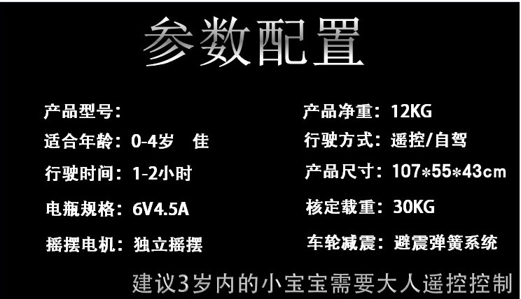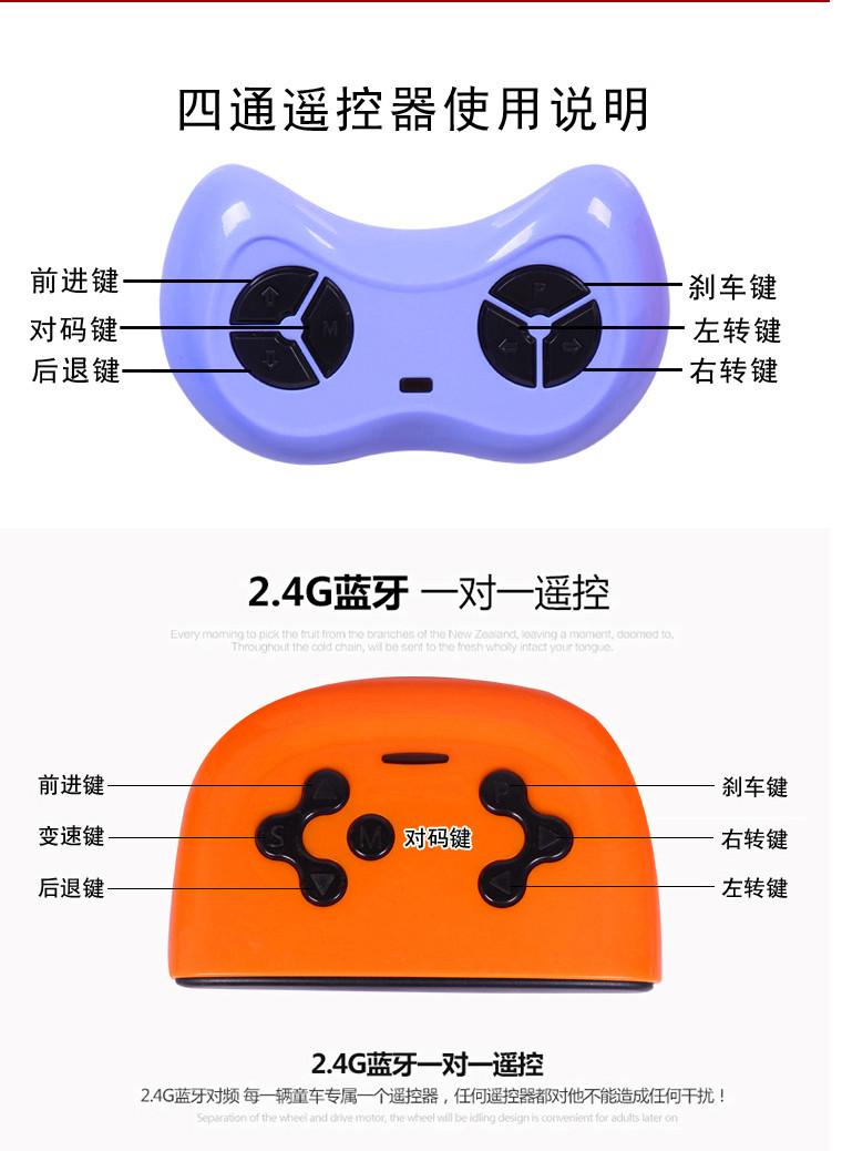Bird King-Children's electric car. Configuration: Extreme dual-drive dual-electric slow start + 2.4G Bluetooth remote control + early, high-match dual-drive dual-electric + four-way remote control, middle with single-drive single-electric + four-way remote control. Color: red, black, purple, white. This product is mainly supplied to export export companies and direct foreign purchases. The factory is a production enterprise with self-support import and export rights. FOB Tianjin Port, US dollars can be received, OEM samples can be processed by agents. OEM! Company Brand Trademark: "Bird King" "Orma"