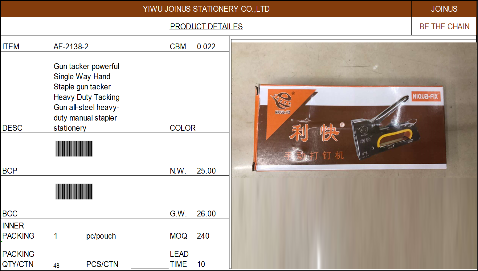 Gun tacker powerful Single Way Hand Staple gun tacker Heavy Duty Tacking Gun NIQUA-FIXheavy-duty manual staplerAF-2138-2