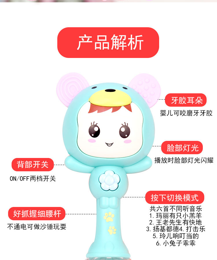 Children's Cartoon Teether Rattle Baby Electric Sound and Light Soothing Rattle Sand Hammer Stick for Practicing Grip Early Childhood Educational Toys