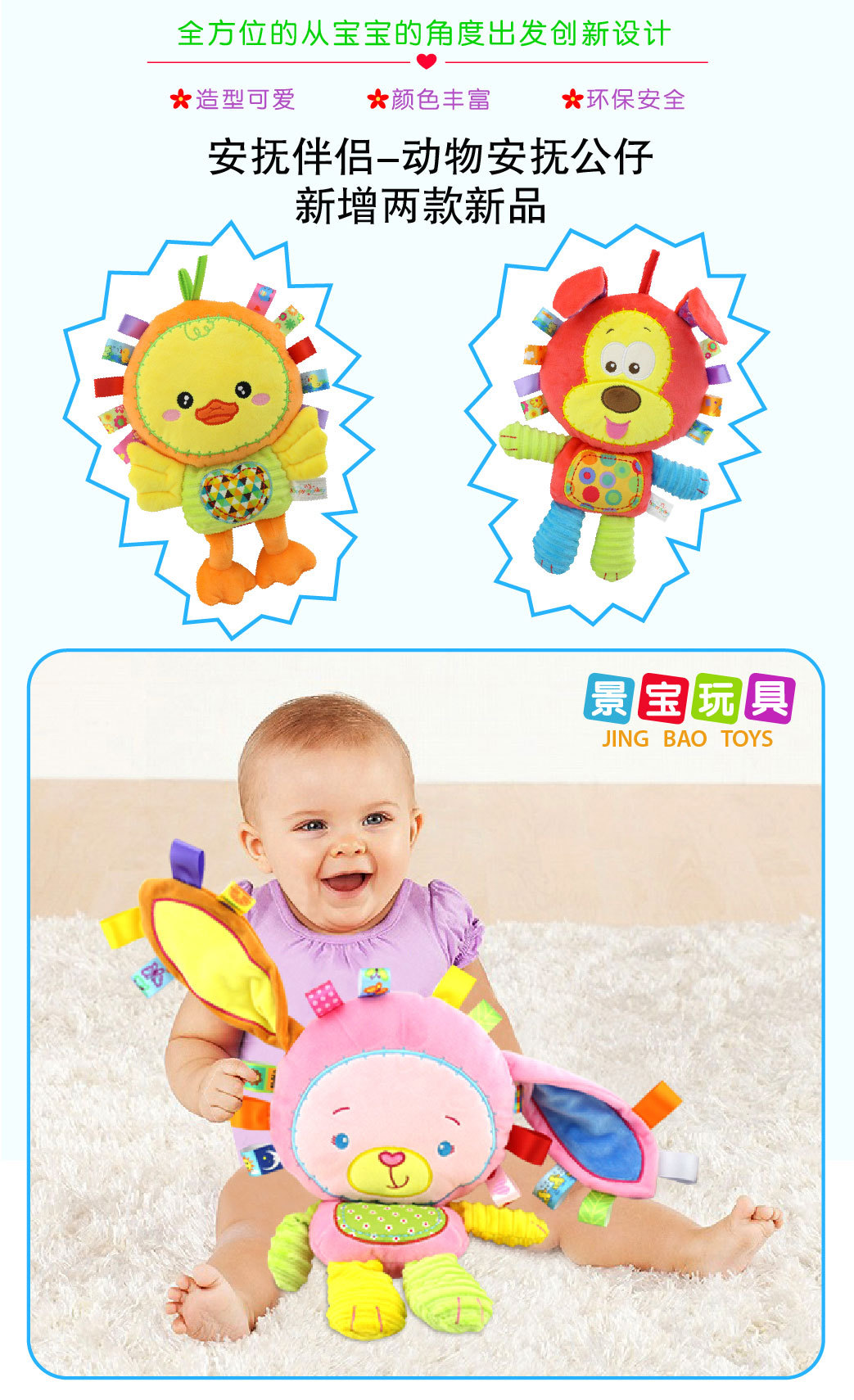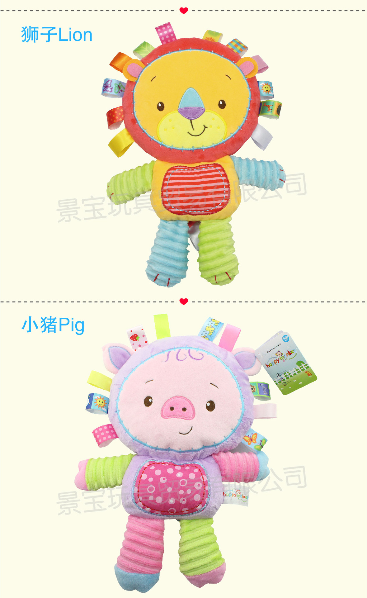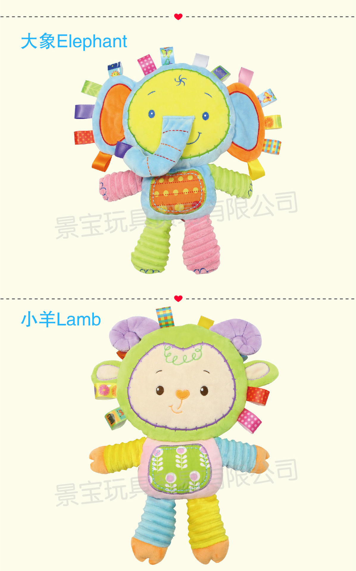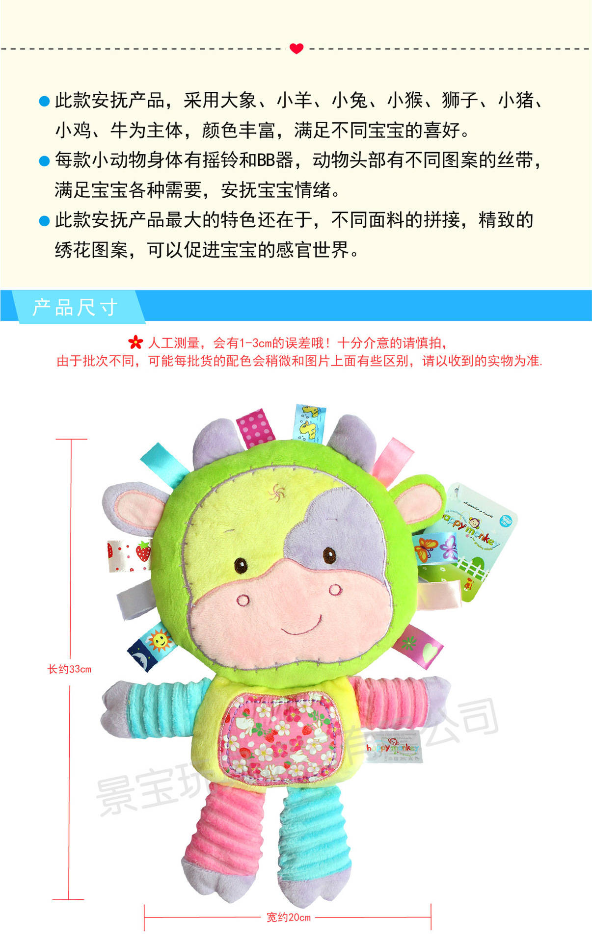 Reassure product, USES the elephants, sheep, rabbit, little monkey, the lion, the pig, the calf as the main body,Color is rich, meet the tastes of different baby.Each animal has a rattle and a BB on its body, and a ribbon with a different pattern on its head.Baby to meet various needs, soothe baby mood.This calm product the biggest characteristic is that the joining together of different fabrics, delicateEmbroider the pattern, may promote the baby's sense world.