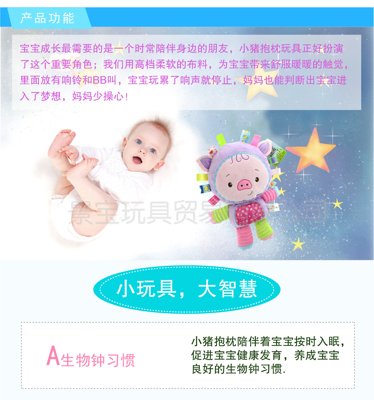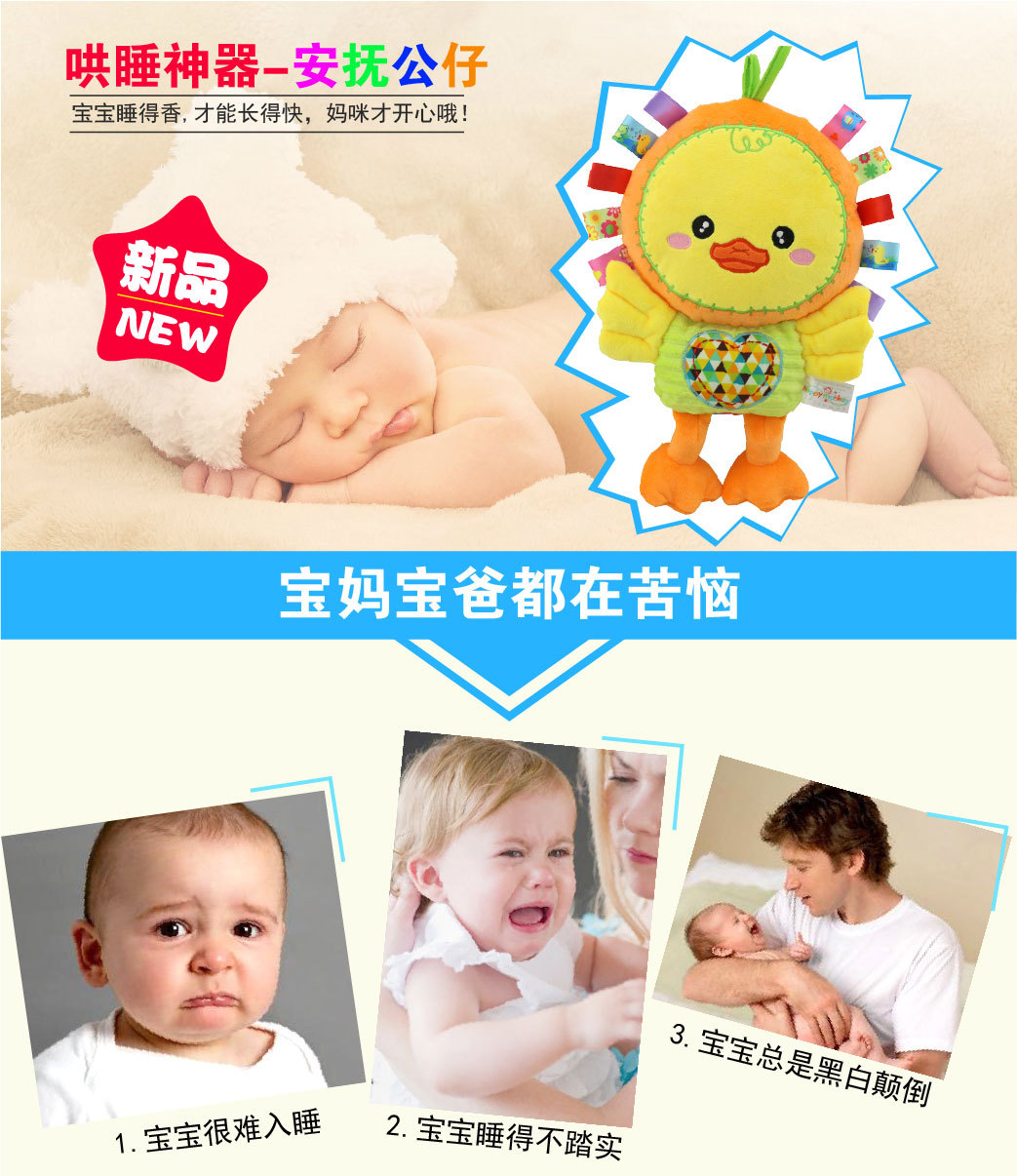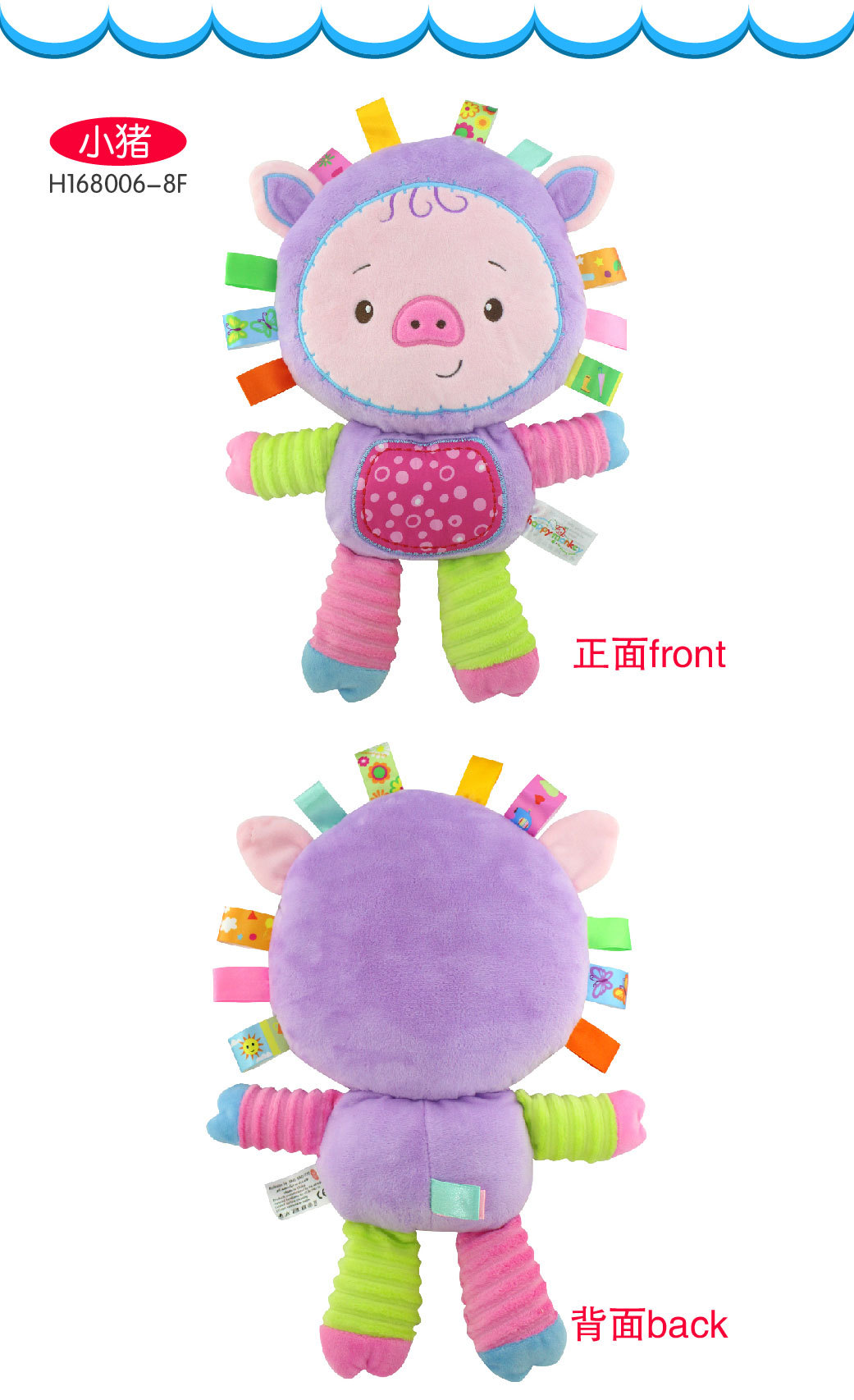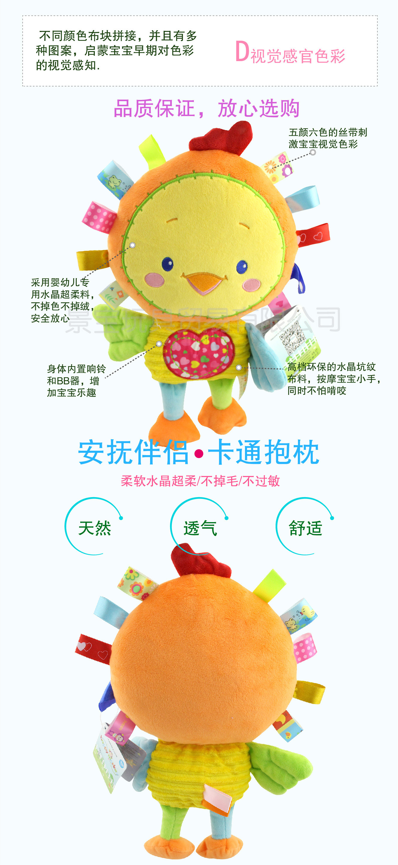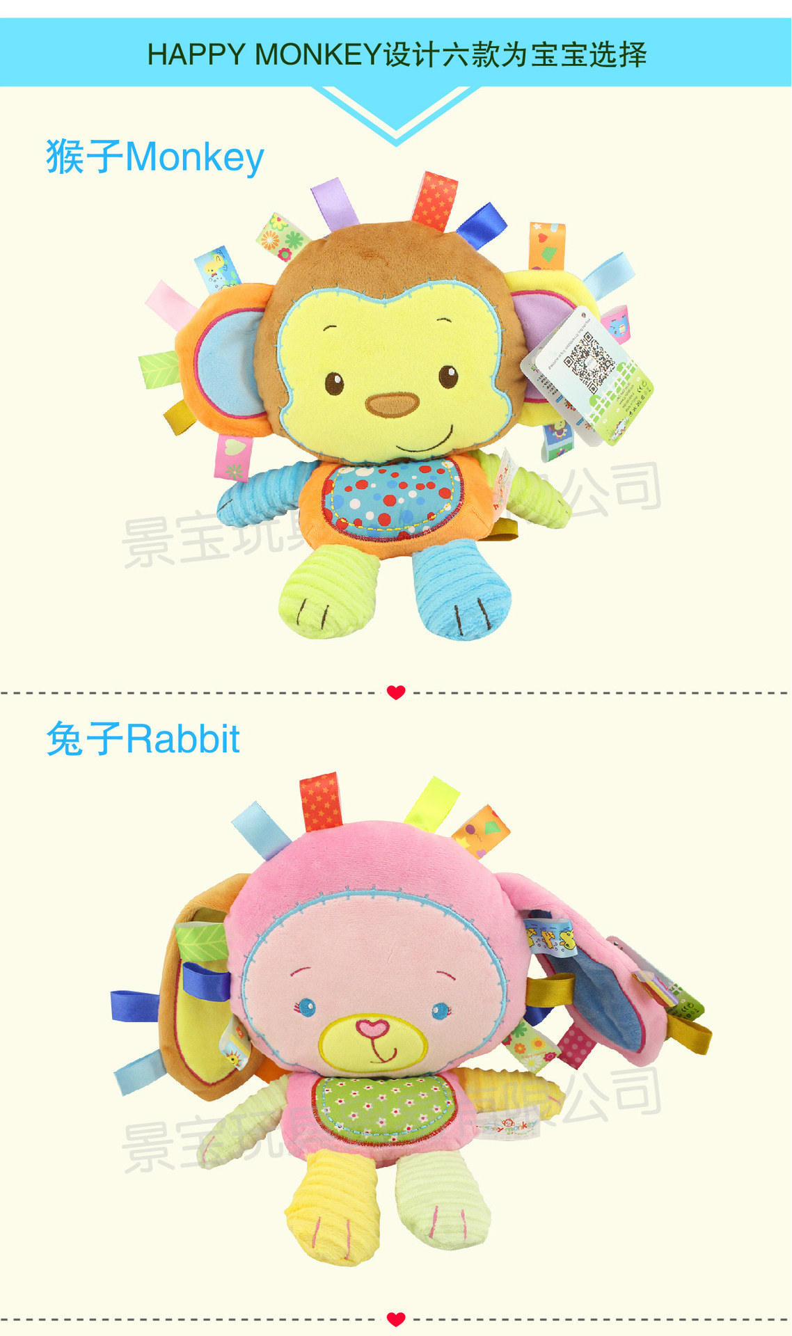 Reassure product, USES the elephants, sheep, rabbit, little monkey, the lion, the pig, the calf as the main body,Color is rich, meet the tastes of different baby.Each animal has a rattle and a BB on its body, and a ribbon with a different pattern on its head.Baby to meet various needs, soothe baby mood.This calm product the biggest characteristic is that the joining together of different fabrics, delicateEmbroider the pattern, may promote the baby's sense world.