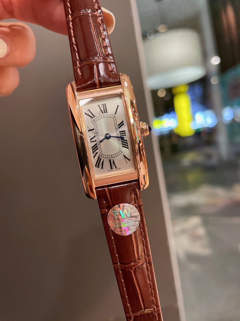 Card home watch small square Watch, using blue treasure Crystal Mirror, Swiss quartz movement. Original mold opening, stainless steel watch case, octagonal crown, inlaid with a synthetic blue spinel, silver-plated dial, sword-shaped blue steel pointer, with original glossy folding watch-buttom, imported multi-color calfskin. Tank Amé ricaine wrist watch is elegant and highly popular. Watchcase size: 34.80 x 19.00mm. High quality, movement one-year warranty, worry-free after-sales