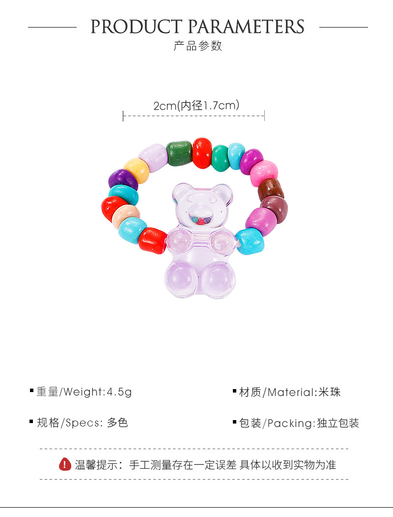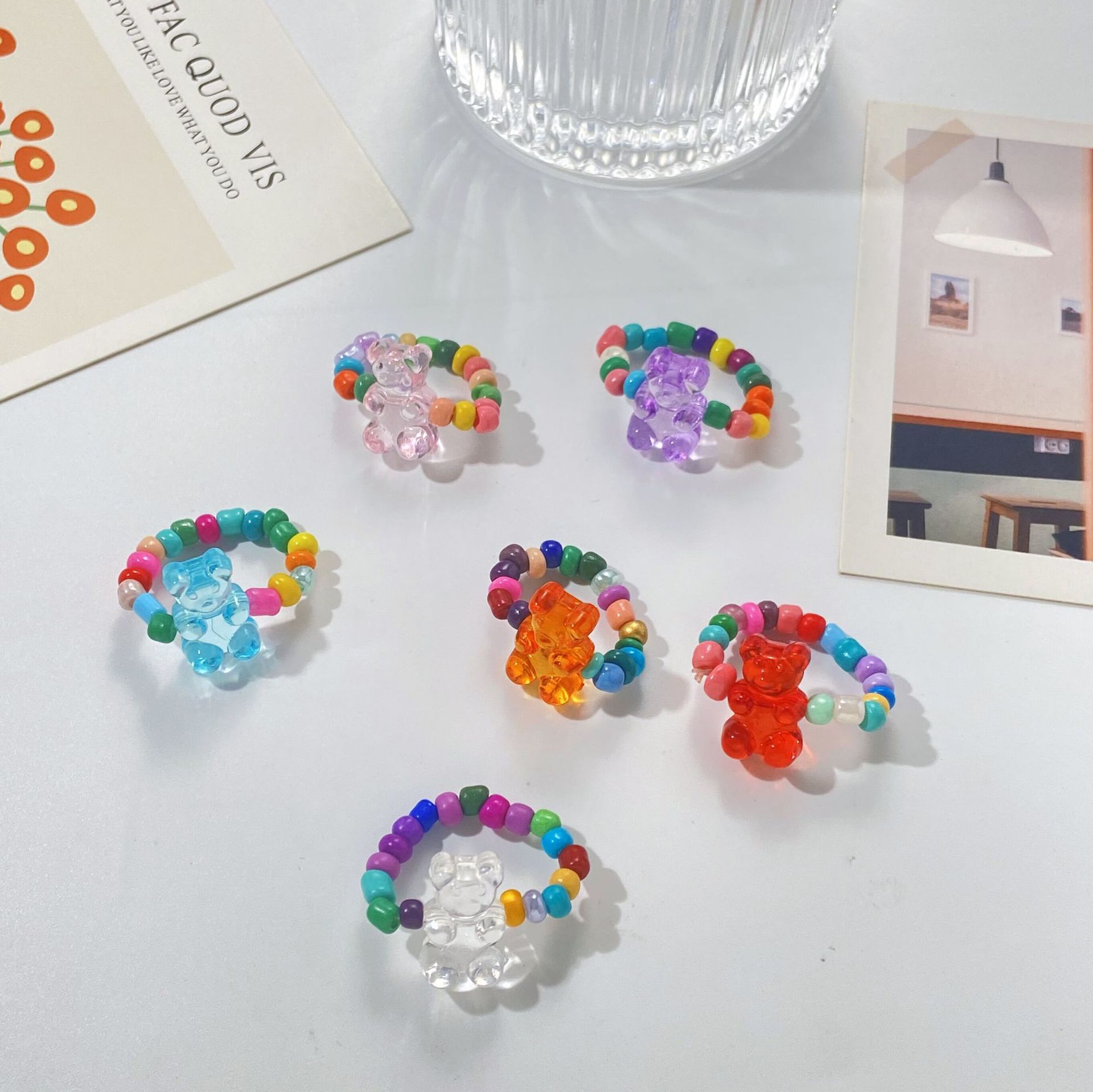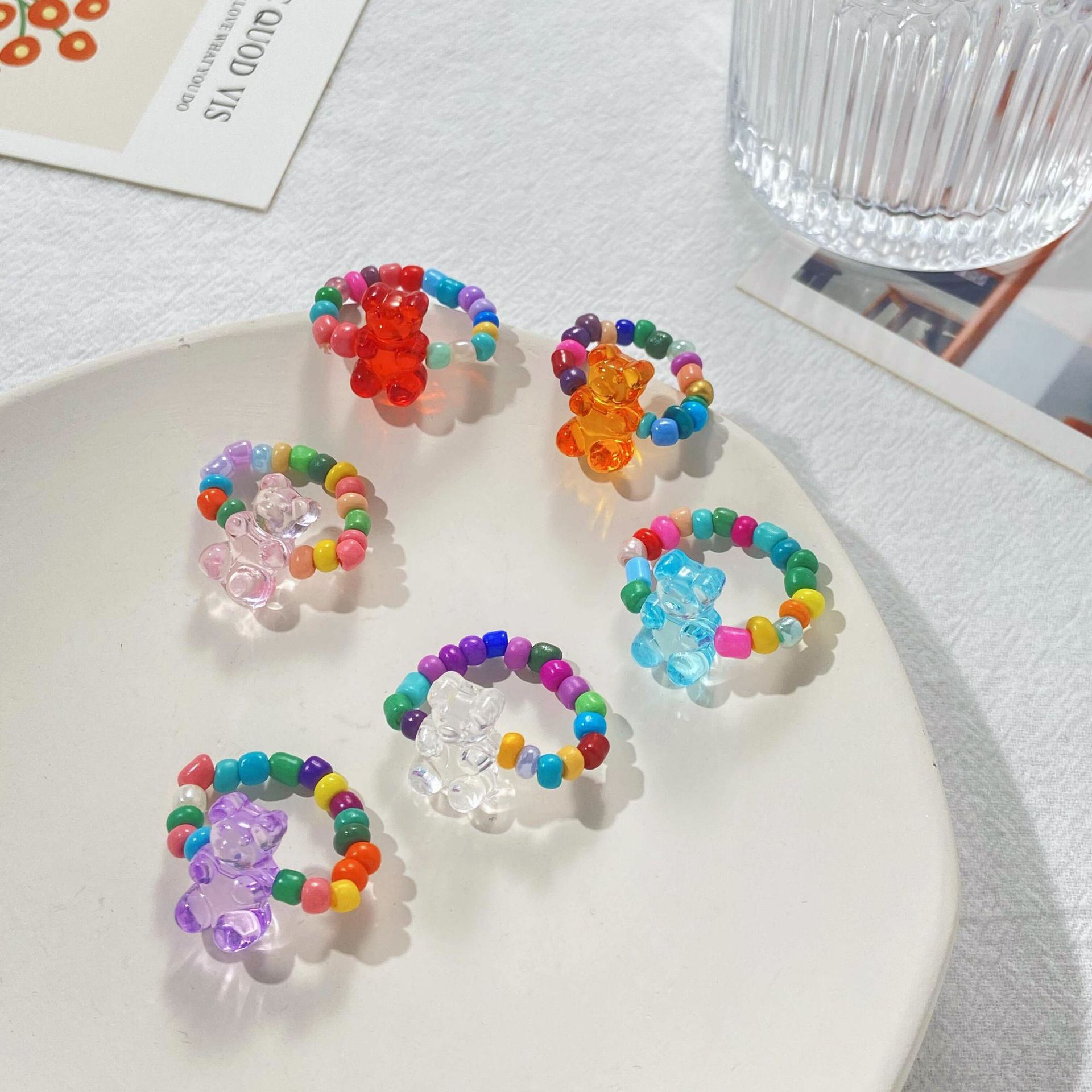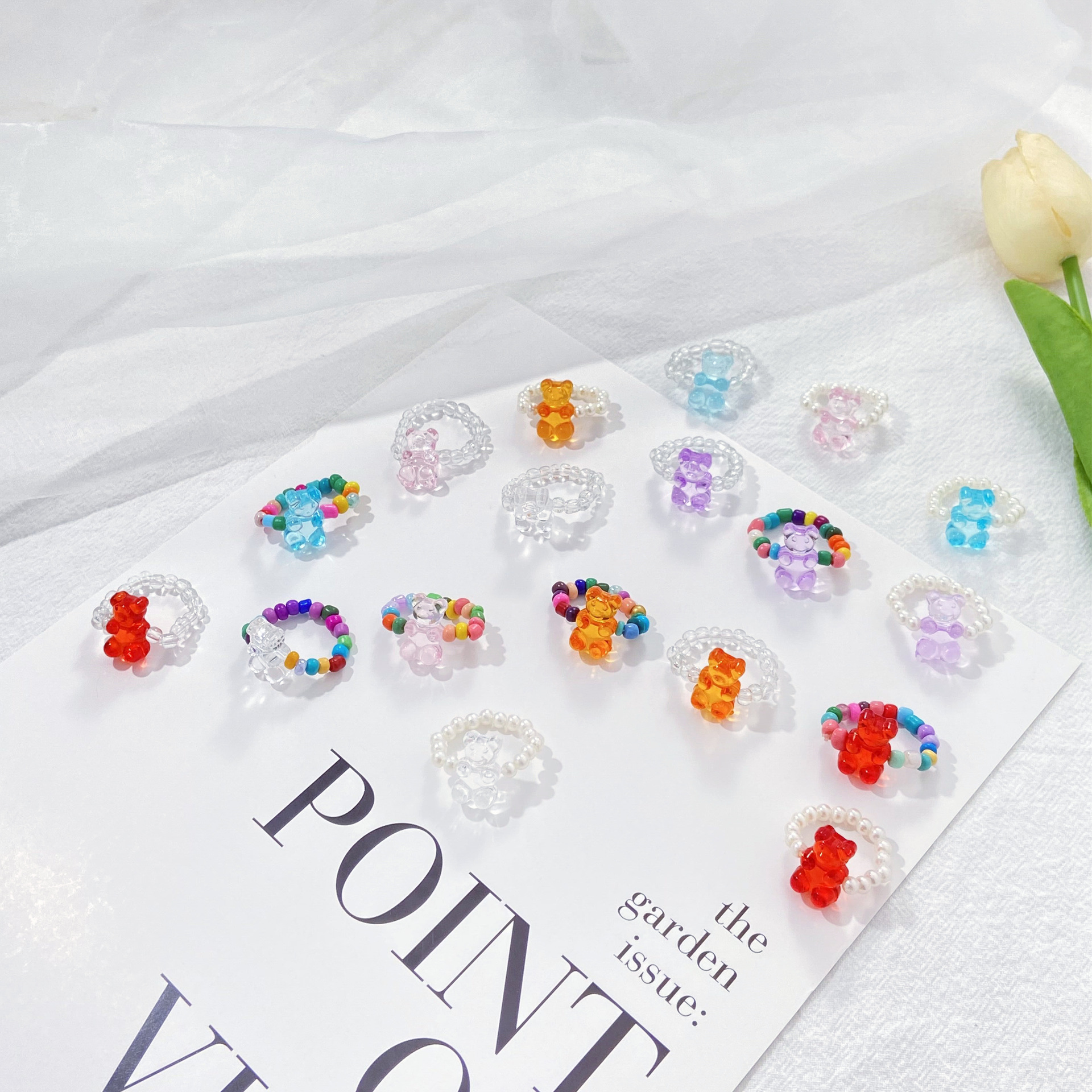 Japan and South Korea Cute Fresh Candy-Colored Bear Stringed Pearls Ring Handmade Elastic String Girl Heart Bead Ring