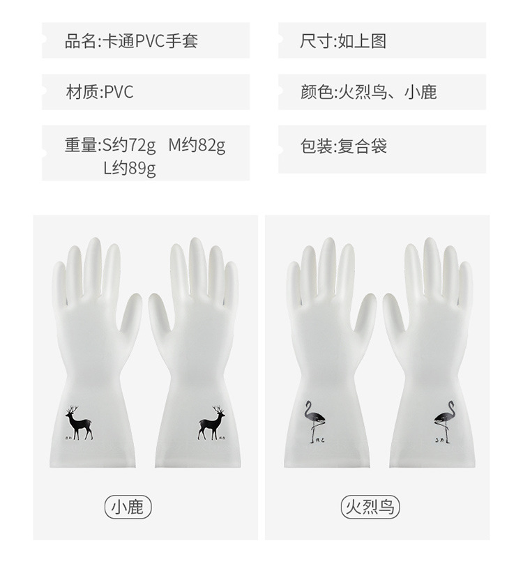 Name: cartoon PVC glovesMaterial: PVC Packaging: combination bagSize: S about 13*30cm M about 13.5 * 30cm L about 14 * 30cmColor: Deer/FlamingoWeight: S about 72g M of about 82 grams L to about 89 grams
