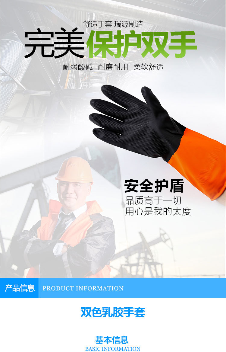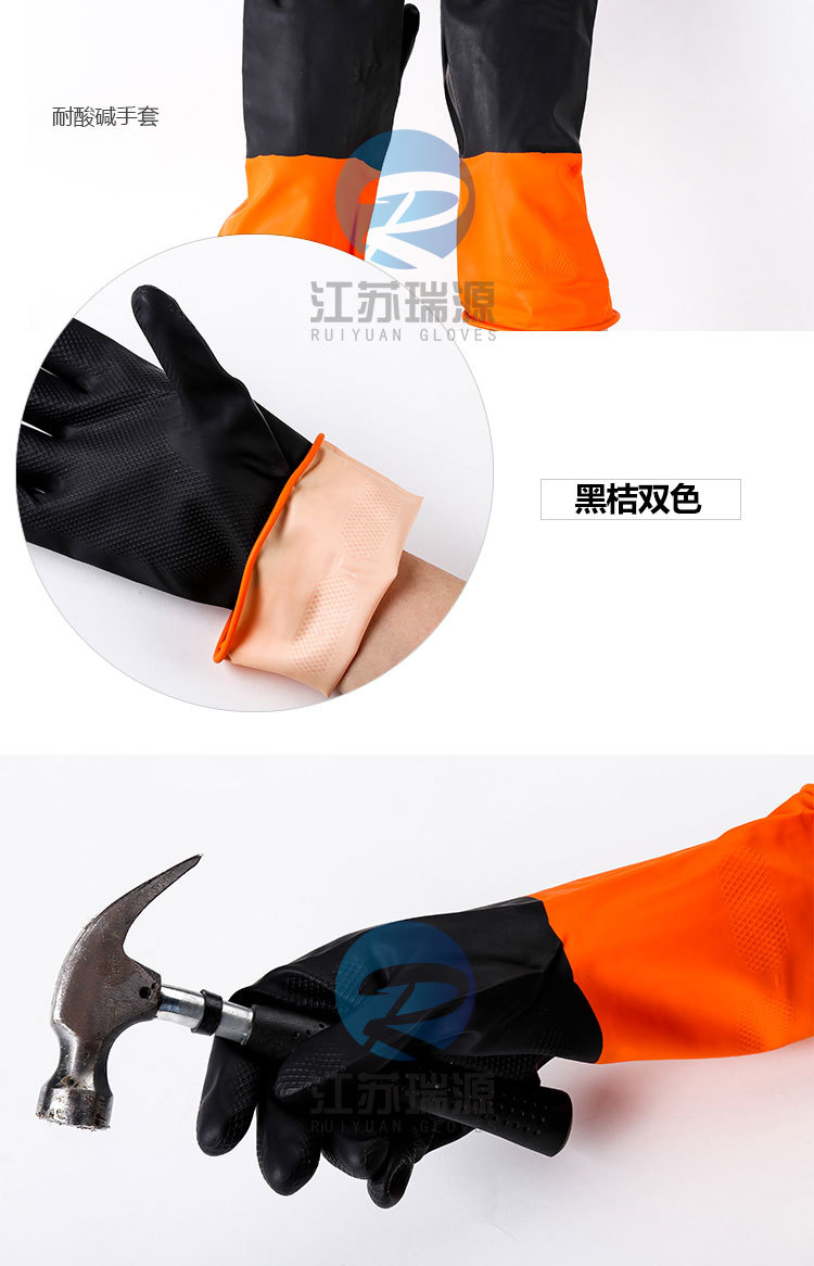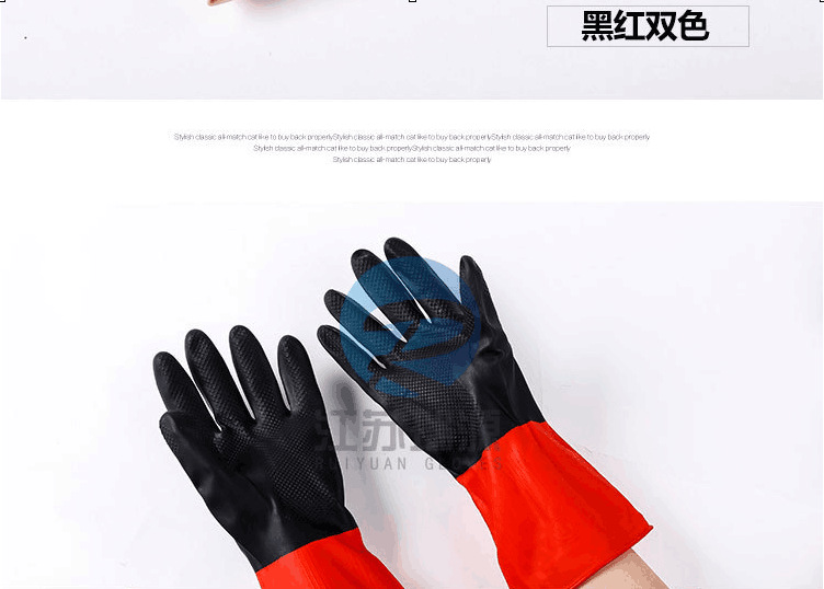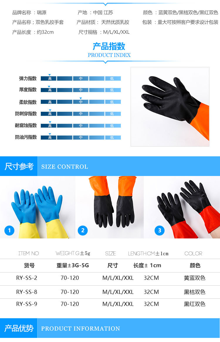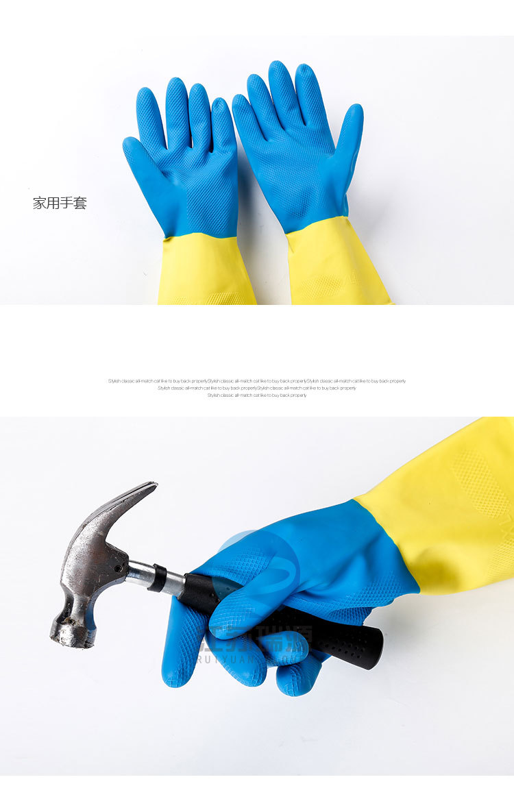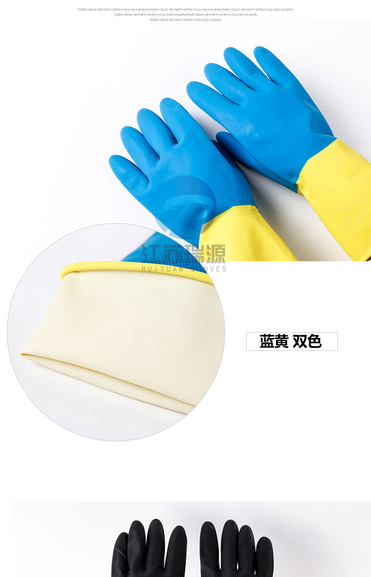[product name] : natural latex gloves (blue and yellow, blue and black, red and black)Product origin: jiangsuProduct material: latex[product packaging] : 1 pair/plastic bag / 300 pairs/piecesProduct length: 32CM±1cm[product weight] : 100g ± 5g (large and small sizes will vary)[product usage] : it is widely used in hotel, housework, floor cleaning, toilet, bathroom, automobile, construction industry, chemical industry, printing, fishery, aquatic product processing, food processing, and water operation occasions, catering, crop planting, beauty and other industries.